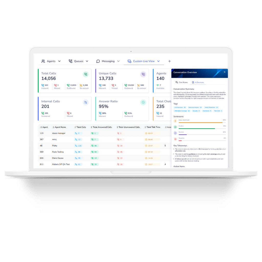 Handles inbound and outbound voice calls, WhatsApp, SMS, intelligent routing, IVR, and real-time monitoring in one interface. Includes a built-in webphone, contact management, automated workflows, and customizable dashboards. AI features cover transcription in 100+ languages, summaries, and sentiment analysis.